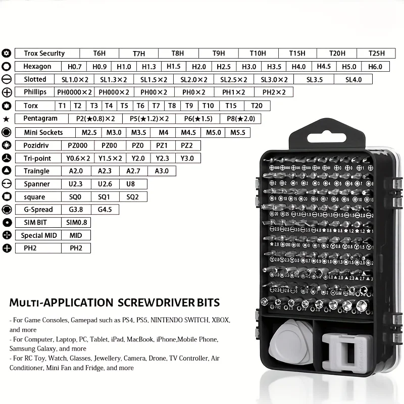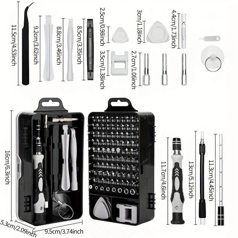Kit de ferramentas manuais para reparo e desmontagem de computadores, smartphones e relógios.