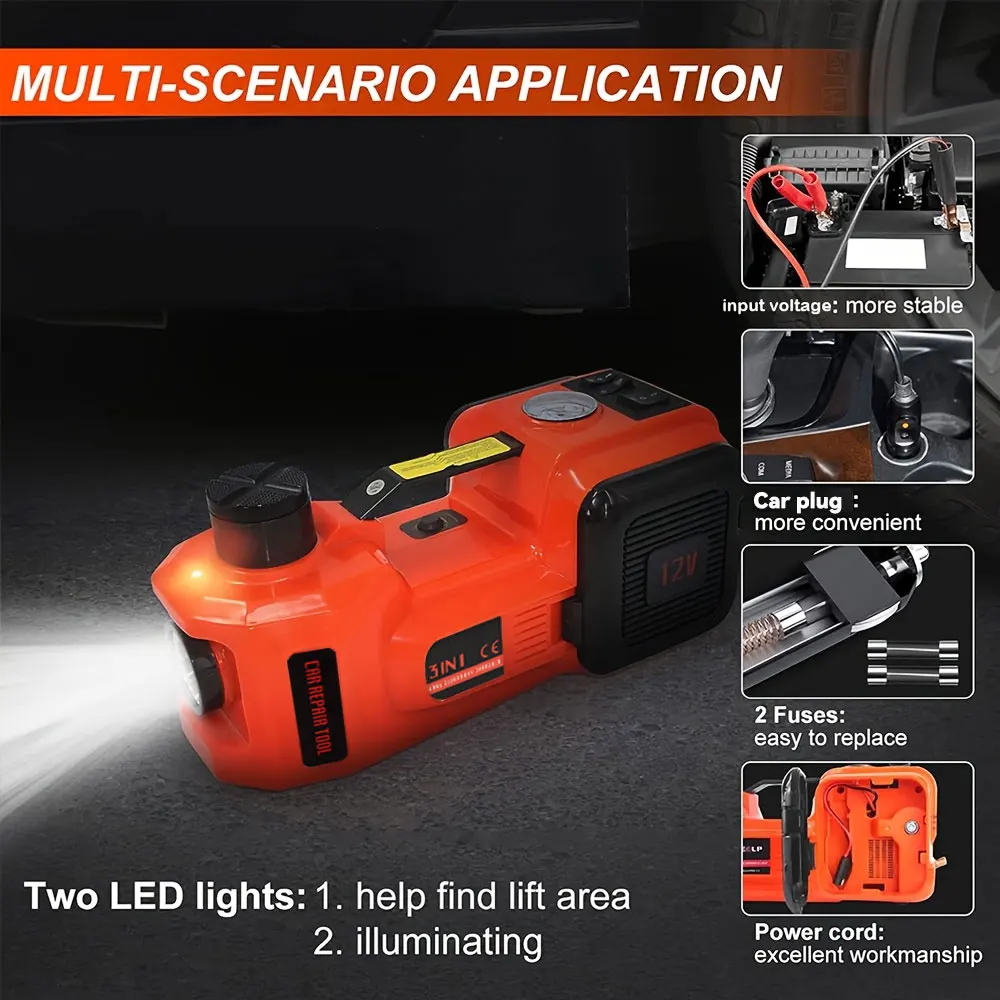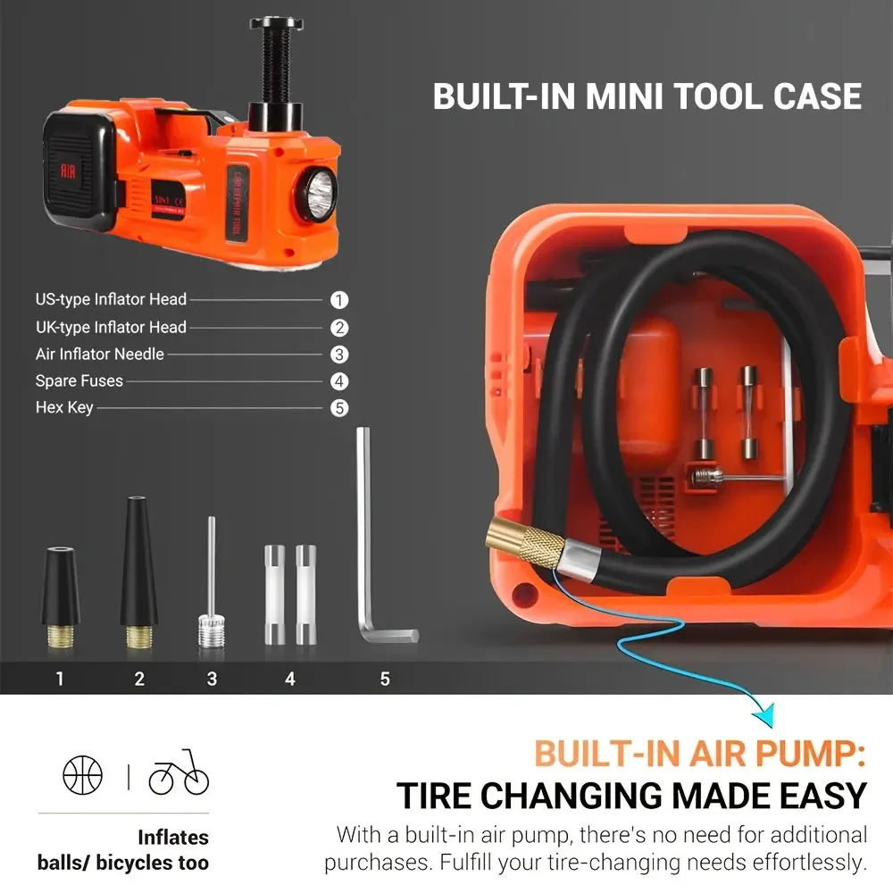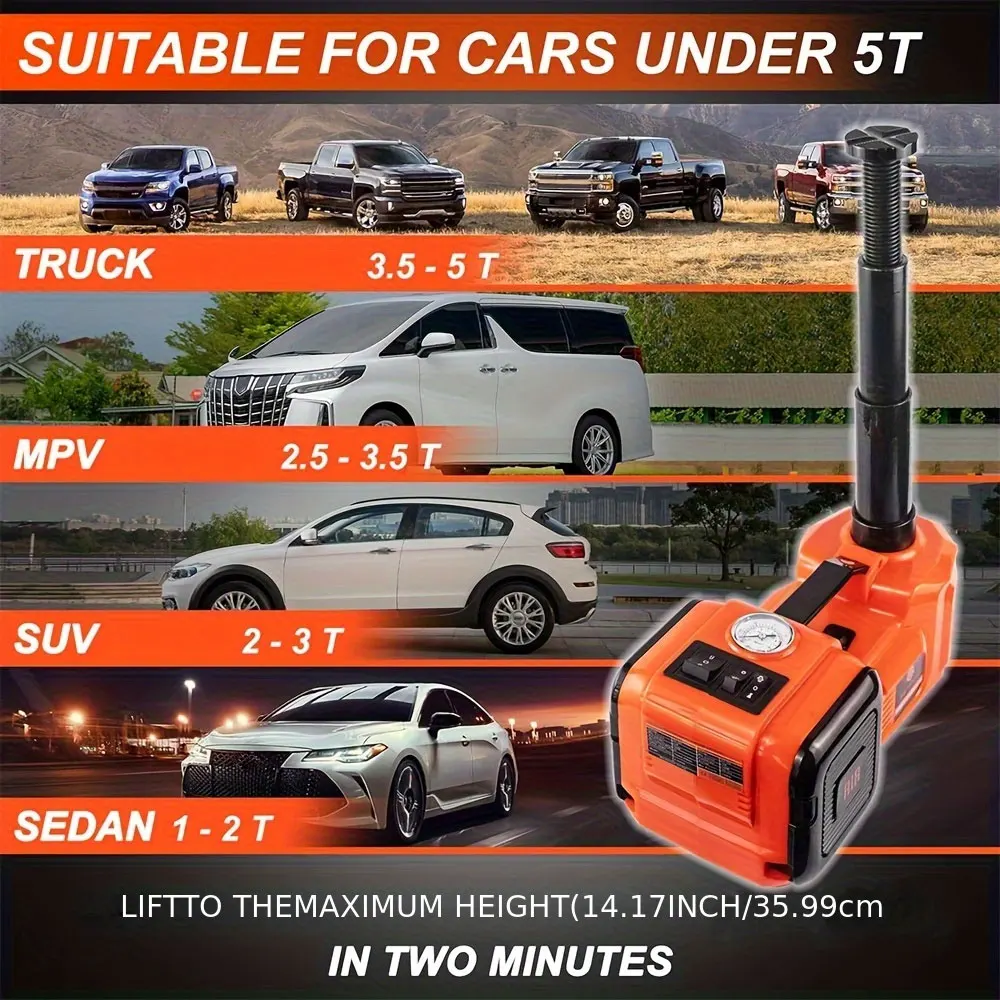 Macaco elétrico hidráulico automotivo 5 toneladas 4 em 1, 12V, com bomba infladora e luz LED, para reparo de pneus de carros e caminhões