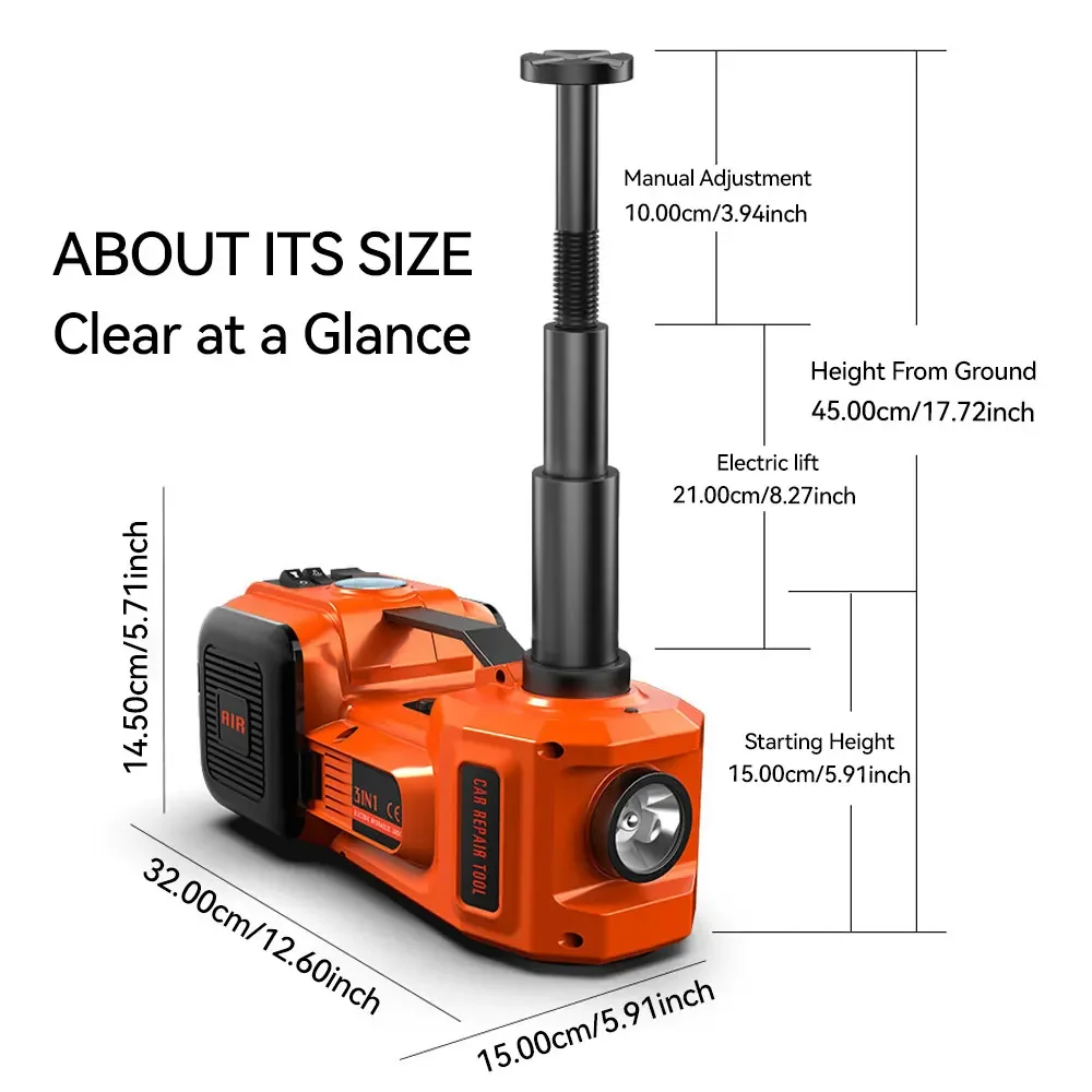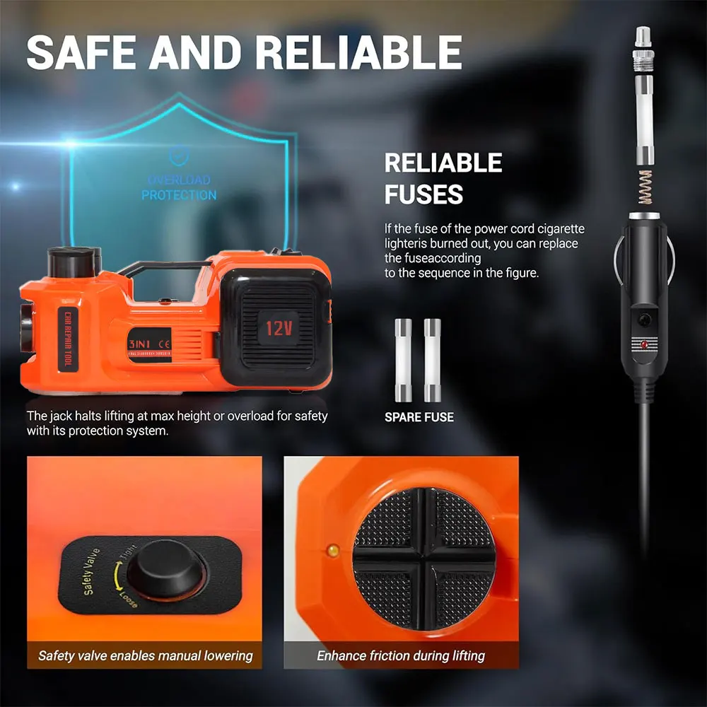 Macaco elétrico hidráulico de 5 toneladas, funciona com tomada veicular 12V. É capaz de levantar o carro em menos de 1 minuto. Com a chave, você pode remover os parafusos rapidamente e trocar o pneu com facilidade.